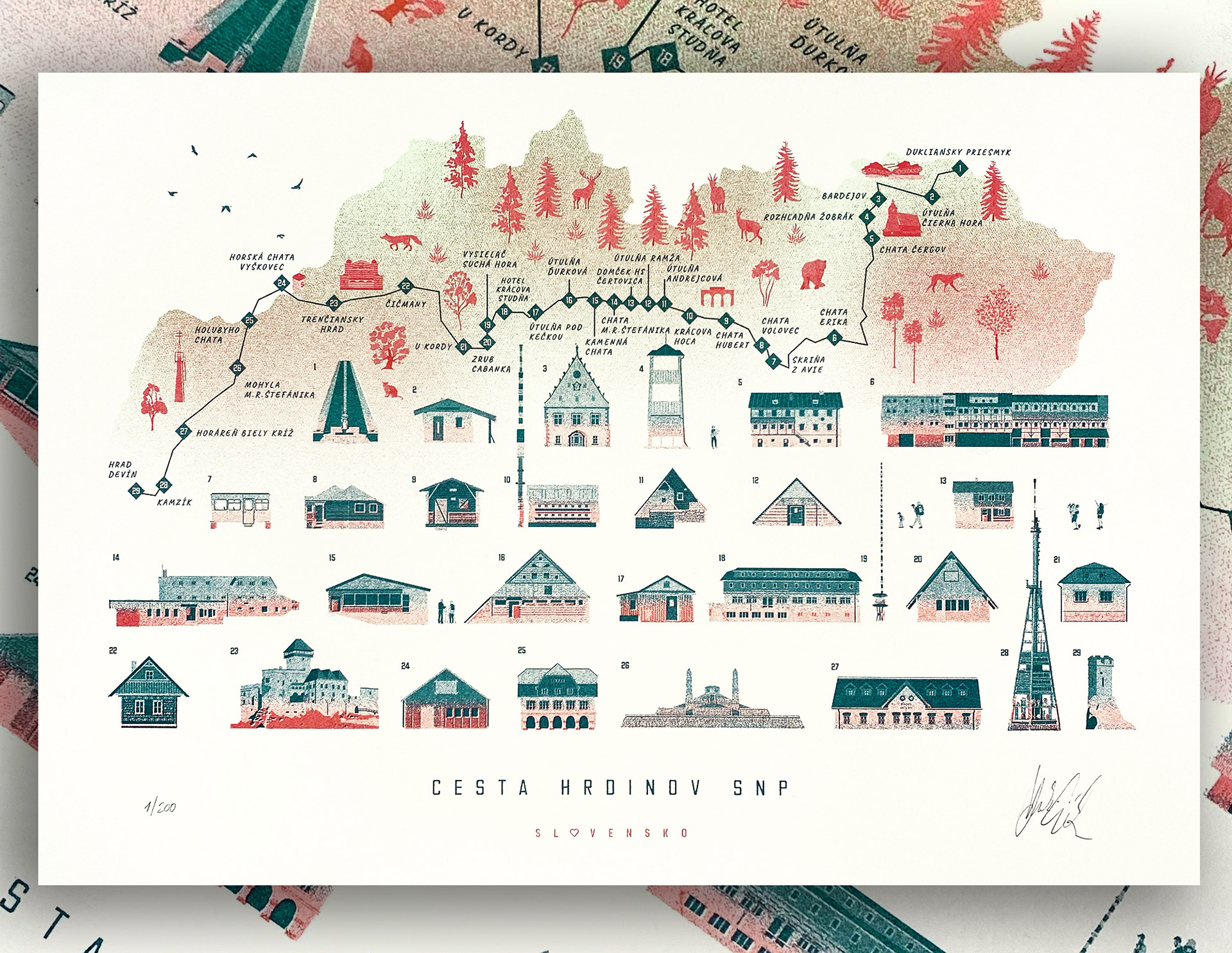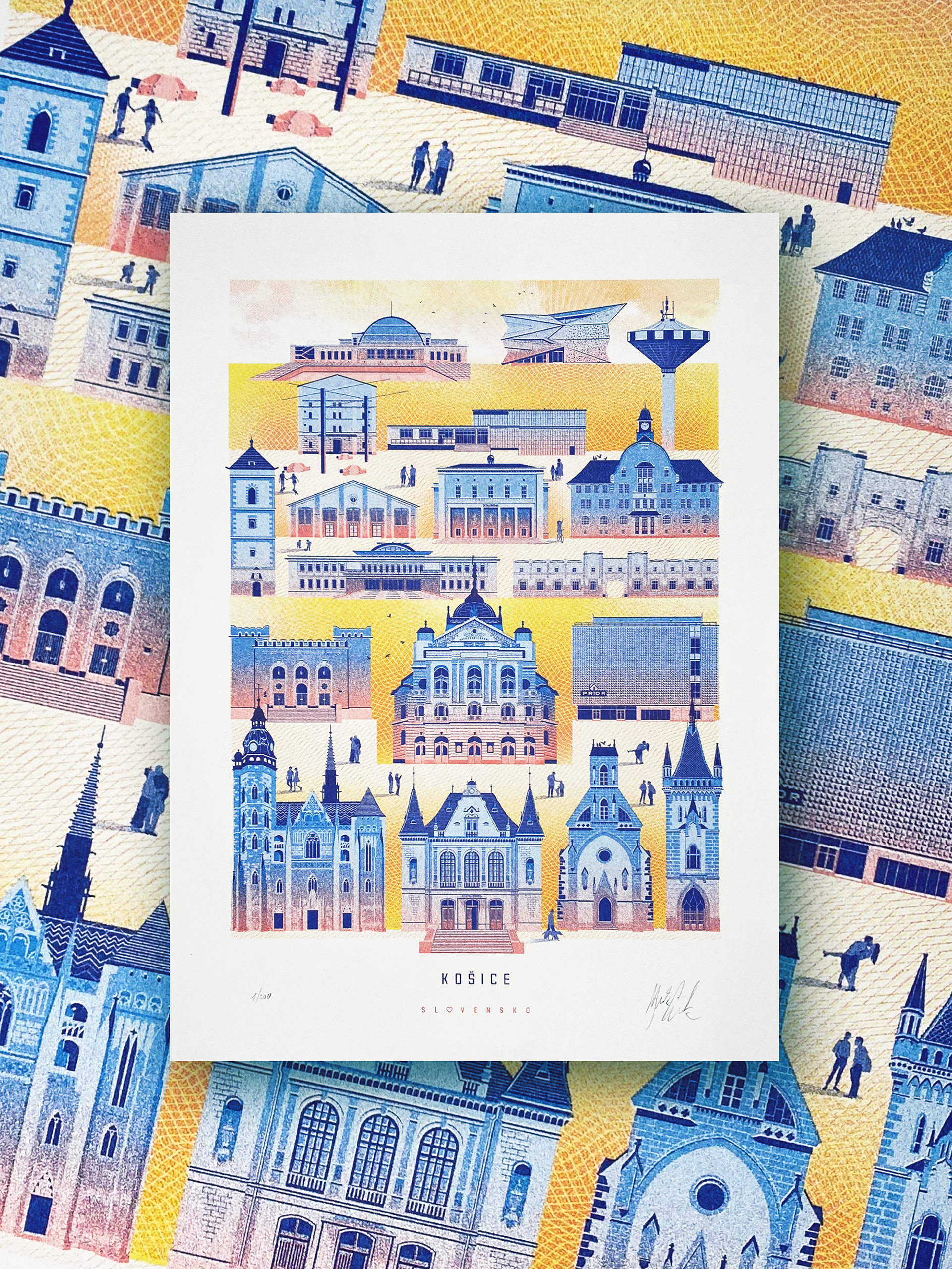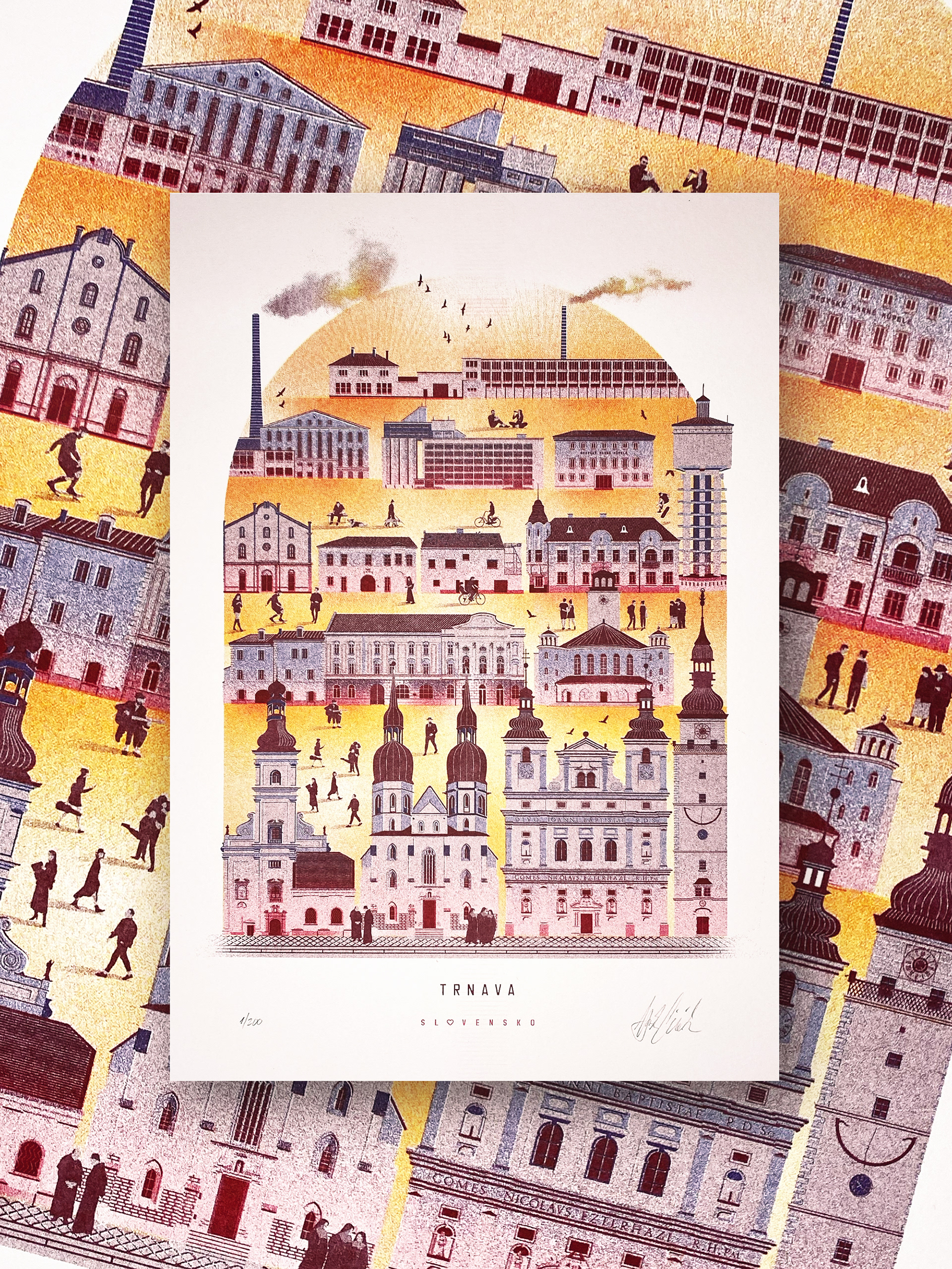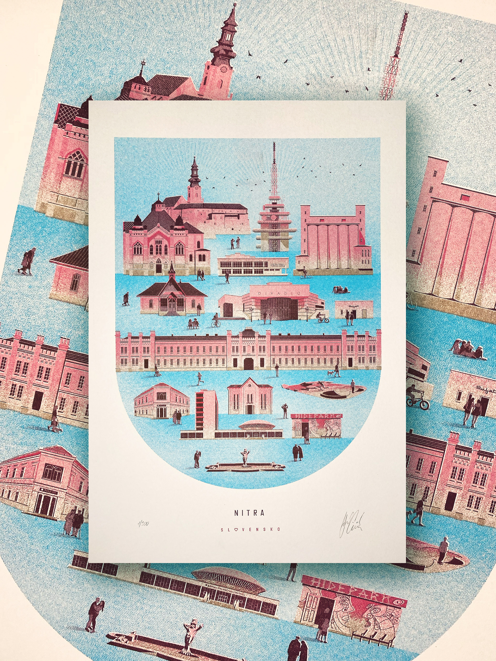 Zbierka ilustrácií miest v risografike, špecialnej forme tlače pomocou vrstvenia farieb na seba.